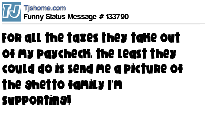 - # 137225 For all the taxes they take out of my paycheck they should at least send me a picture of the broke ass family I support to hang on my fridge.