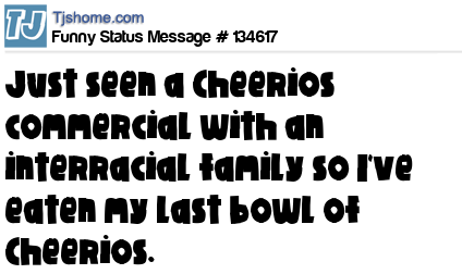 X says Just seen a Cheerios commercial with an interracial family so I've eaten my last bowl of Cheerios.