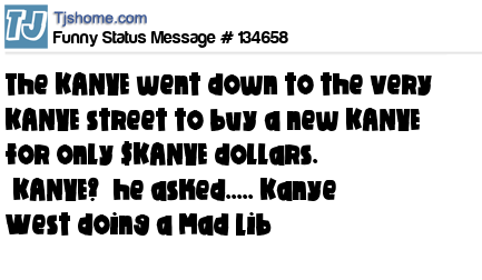 X The KANYE went down to the very KANYE street to buy a new KANYE for only $KANYE dollars. “KANYE?” he asked..... Kanye West doing a Mad Lib
