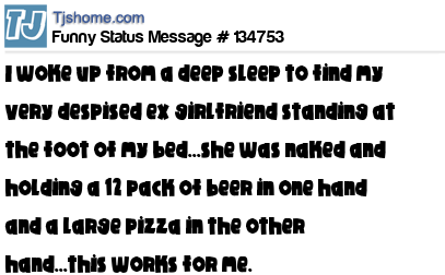 X says I woke up from a deep sleep to find my very despised ex girlfriend standing at the foot of my bed...she was naked and holding a 12 pack of beer in one hand and a large pizza in the other hand...this works for me.