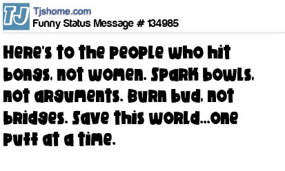X Here's to the people who hit bongs, not women. Spark bowls, not arguments. Burn bud, not bridges. Save this world...one puff at a time.