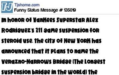X says In honor of Yankees Superstar Alex Rodriguez's 211 game suspension for steroid use, the city of New York has announced that it plans to name the Verazno-Narrows Bridge (The longest suspension bridge in the world) the "A-Rod Suspension Bridge."