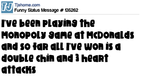 X I've been playing the Monopoly game at McDonalds and so far all I've won is a double chin and 3 heart attacks