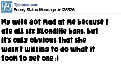X  my wife got mad at me because I ate all six Klondike bars, but it's only obvious that she wasn't willing to do what it took to get one ;)