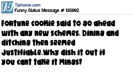 X says Fortune cookie said to go ahead with any new schemes. Dining and ditching then seemed justifiable.Why dish it out if you cant take it Mings?