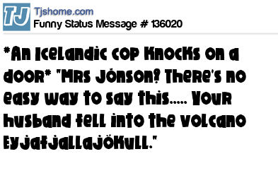 X *An Icelandic cop knocks on a door* "Mrs Jónson? There's no easy way to say this..... Your husband fell into the volcano Eyjafjallajökull."