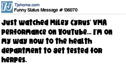 X says Just watched Miley Cyrus' VMA performance on YouTube... I'm on my way now to the health department to get tested for herpes.