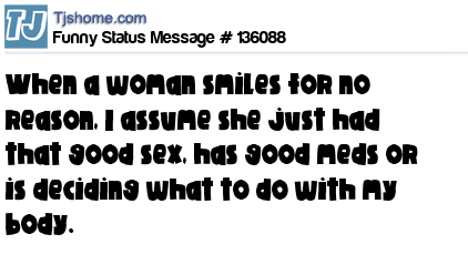 X says When a woman smiles for no reason, I assume she just had that good sex, has good meds or is deciding what to do with my body.