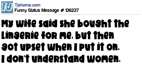 - # 199485 My wife said she bought the lingerie for me, but then got upset when I put it on... I just don't get women.