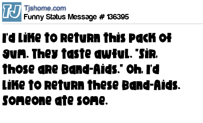 - # 127593 I'd like to return this pack of gum, They taste awful... "Sir, those are Band-Aids."... Oh, I'd like to return these Band-Aids,, Someone ate some.