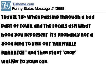 X is Travel Tip: When passing through a bad part of town, and the locals ask what hood you represent, it's probably not a good idea to yell out "FARMVILLE BIIAAATCH," and then start "crop" walkin' to your car.