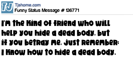 - # 180143 I'm the kind of friend who will help you hide a dead body but if you betray me, just remember: I know how to hide a dead body.