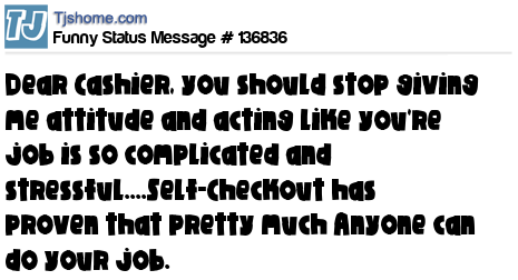 X Dear Cashier, you should stop giving me attitude and acting like you're job is so complicated and stressful....Self-Checkout has proven that pretty much Anyone can do your job.