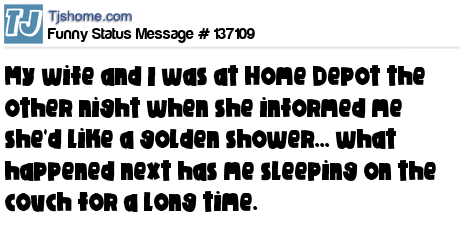 X  My wife and I was at Home Depot the other night when she informed me she'd like a golden shower... what happened next has me sleeping on the couch for a long time.