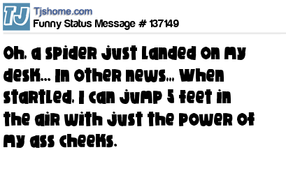 X Oh, a spider just landed on my desk... In other news,,, When startled, I can jump 5 feet in the air with just the power of my ass cheeks.