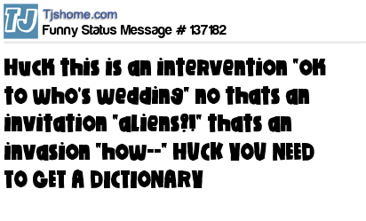 X says Huck this is an intervention "ok to who's wedding" no thats an invitation "aliens?!" thats an invasion "how--" HUCK YOU NEED TO GET A DICTIONARY