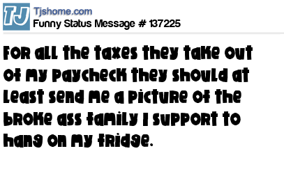 X For all the taxes they take out of my paycheck they should at least send me a picture of the broke ass family I support to hang on my fridge.