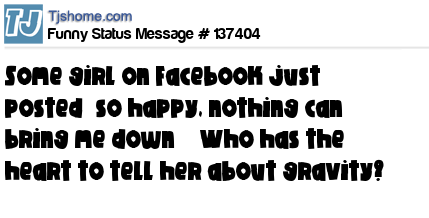 - # 180932 Some girl on Facebook just posted "I'm so happy right now that nothing can bring me down!" Should I tell her about gravity?