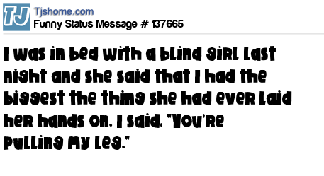 - # 105002 I was in bed with a blind girl last night and she said that I had the biggest pen$s she had ever laid her hands on. I said "You're pulling my leg"