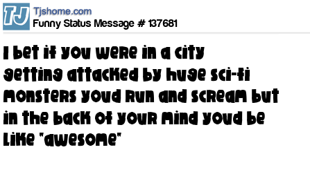 X says I bet if you were in a city getting attacked by huge sci-fi monsters youd run and scream but in the back of your mind youd be like "awesome"