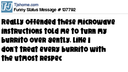 - # 147199 Really offended these microwave instructions told me to turn my burrito over gently like I don’t treat every burrito with the utmost respect.
