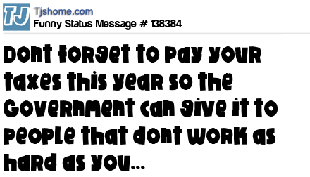 - # 164529 Don't forget to pay your taxes this year so the Government can give it to people that don't work as hard as you.