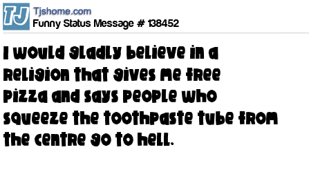X says I would gladly believe in a religion that gives me free pizza and says people who squeeze the toothpaste tube from the centre go to hell.