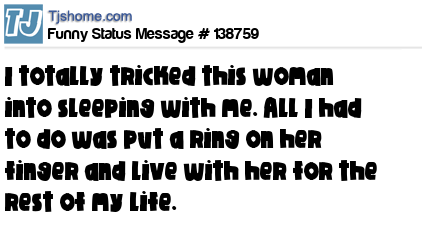 X says I totally tricked this woman into sleeping with me. All I had to do was put a ring on her finger and live with her for the rest of my life.