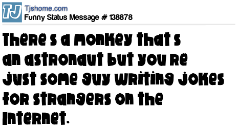 - # 138893 You're aying, "There’s a monkey that’s an astronaut but you’re just some guy writing jokes for strangers on the Internet." َ A loyal stranger is better than a greedy and two faced friend.