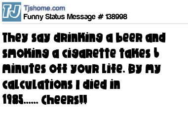 X says They say drinking a beer and smoking a cigarette takes 6 minutes off your life. By my calculations I died in 1985...... Cheers!!