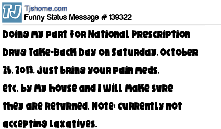 X says Doing my part for National Prescription Drug Take-Back Day on Saturday, October 26, 2013, just bring your pain meds, etc. by my house and I will make sure they are returned. Note: currently not accepting laxatives.