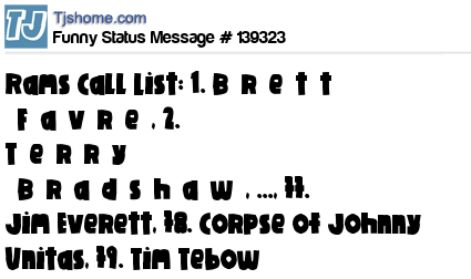 X Rams Call List: 1. B̶r̶e̶t̶t̶ ̶F̶a̶v̶r̶e̶, 2. T̶e̶r̶r̶y̶ ̶B̶r̶a̶d̶s̶h̶a̶w̶, ..., 77. Jim Everett, 78. Corpse of Johnny Unitas, 79. Tim Tebow