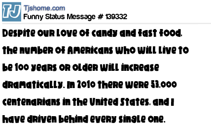 - # 208424 Despite our love of candy and fast food, the number of Americans who will live to be 100 years or older is increasing dramatically. In 2010 there were 53,000 centenarians in the United States. Today there are 97,000… and I have driven behind every singl