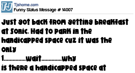 X just got back from getting breakfast at Sonic. Had to park in the handicapped space cuz it was the only 1...............wait..............why is there a handicapped space at Sonic?!?