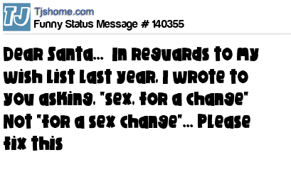 X Dear Santa... In reguards to my wish list last year, I wrote to you asking, "sex, for a change" Not "for a sex change"... Please fix this