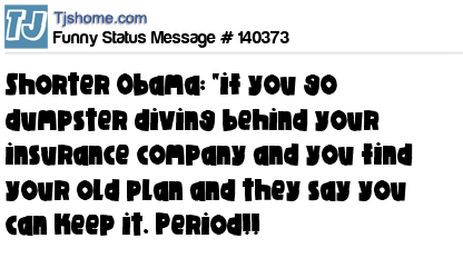 X Shorter Obama: "if you go dumpster diving behind your insurance company and you find your old plan and they say you can keep it. Period!!