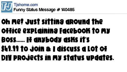 X Oh me? Just sitting around the office explaining Facebook to my Boss...... If anybody asks it's $49.99 to join & I discuss a lot of DIY projects in my status updates.