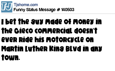 X says I bet the guy made of money in the Gieco commercial doesn't ever ride his motorcycle on Martin Luther King Blvd in any town.