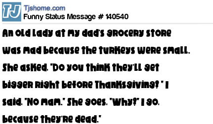 X An old lady at my dad's grocery store was mad because the turkeys were small. She asked, "Do you think they'll get bigger right before Thanksgiving? " I said, "No mam." She goes, "Why?" I go, because they're dead."