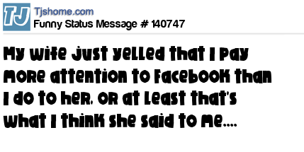 X says My wife just yelled that I pay more attention to Facebook than I do to her, or at least that's what I think she said to me....