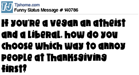 X says If you're a vegan an atheist and a liberal, how do you choose which way to annoy people at Thanksgiving first?