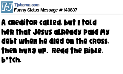 X says A creditor called, but I told her that Jesus already paid my debt when he died on the cross, then hung up. Read the Bible, b*tch.