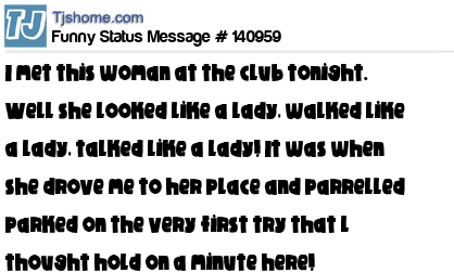 X says I met this woman at the club tonight. Well she looked like a lady, walked like a lady, talked like a lady! It was when she drove me to her place and parrelled parked on the very first try that l thought hold on a minute here!