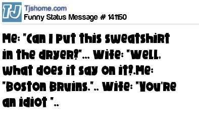 X Me: "Can I put this sweatshirt in the dryer?"... Wife: "Well, what does it say on it?.Me: "Boston Bruins.".. Wife: "You're an idiot "..