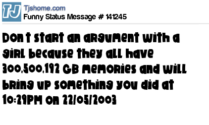 X Don’t start an argument with a girl because they all have 300,500,192 GB memories and will bring up something you did at 10:29PM on 22/05/2003