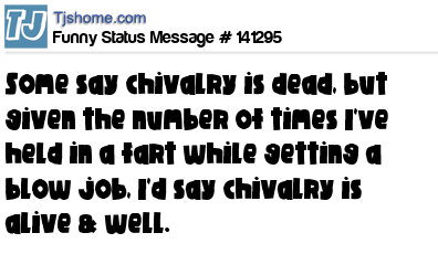X says Some say chivalry is dead, but given the number of times I've held in a fart while getting a blow job, I'd say chivalry is alive & well.