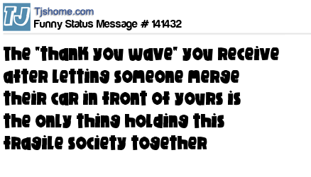 - # 204136 The “thank you wave”after letting someone merge their car in front of yours is one thing holding this fragile society together