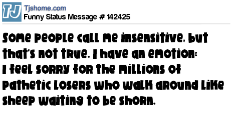 X says Some people call me insensitive, but that's not true. I have an emotion: I feel sorry for the millions of pathetic losers who walk around like sheep waiting to be shorn.