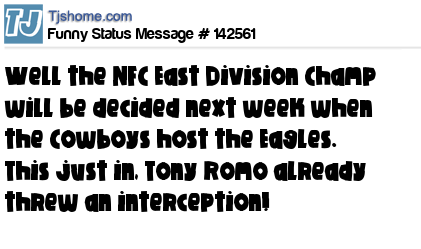 X says Well the NFC East Division Champ will be decided next week when the Cowboys host the Eagles. This just in, Tony Romo already threw an interception!