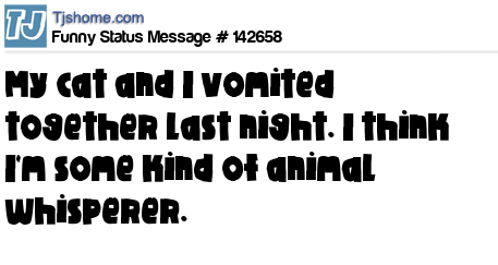 X says My cat and I vomited together last night. I think I'm some kind of animal whisperer.